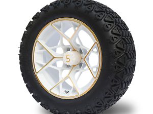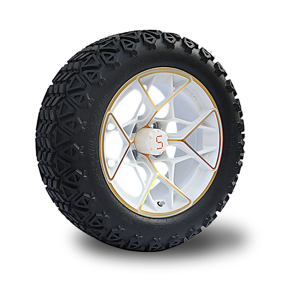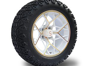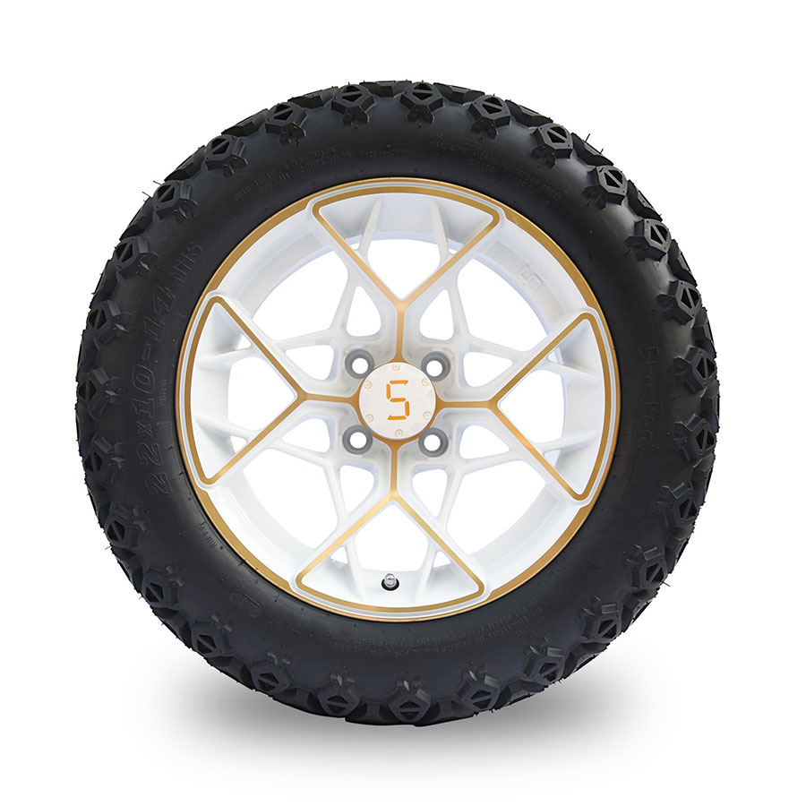 14-inch tyre and wheel combo in Machined White with gold highlights. Ideal for a lifted cart.